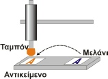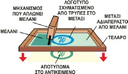 Τότε μια μαλακή ειδική σφραγίδα ακουμπά την επιφάνεια αυτή συλλέγει το μελάνι (διατηρώντας και το σχήμα του λογοτύπου ταυτόχρονα) και το εναποθέτει στο αντικείμενο που θέλουμε. Γίνεται στα περισσότερα χαμηλού κόστους διαφημιστικά αντικείμενα (στυλό, αναπτήρες και διάφορα άλλα ίδιας υφής μικροαντικείμενα). Χαμηλό σχετικά κόστος εκτύπωσης με μεγάλη παραγωγή, αλλά μικρή αντοχή.